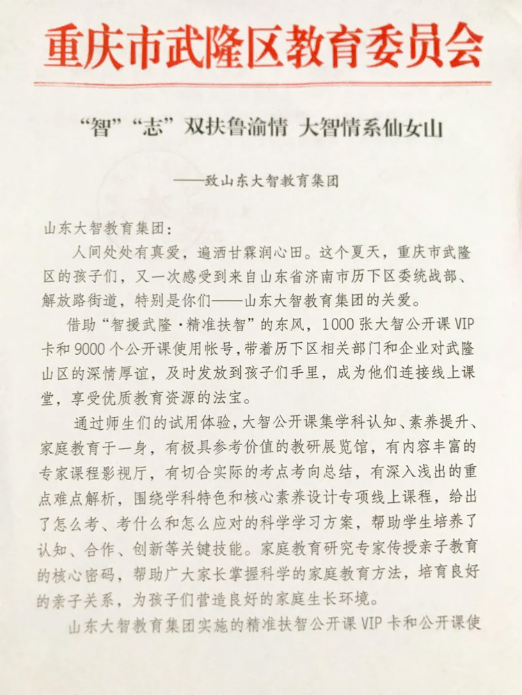 08月24日,重慶市武隆區(qū)教育委員會(huì)給大智寫(xiě)來(lái)感謝信,就大智為武隆區(qū)學(xué)校公益捐贈(zèng)大智公開(kāi)課VIP卡表示感謝。為深入貫徹落實(shí)習(xí)近平總書(shū)記“扶貧...