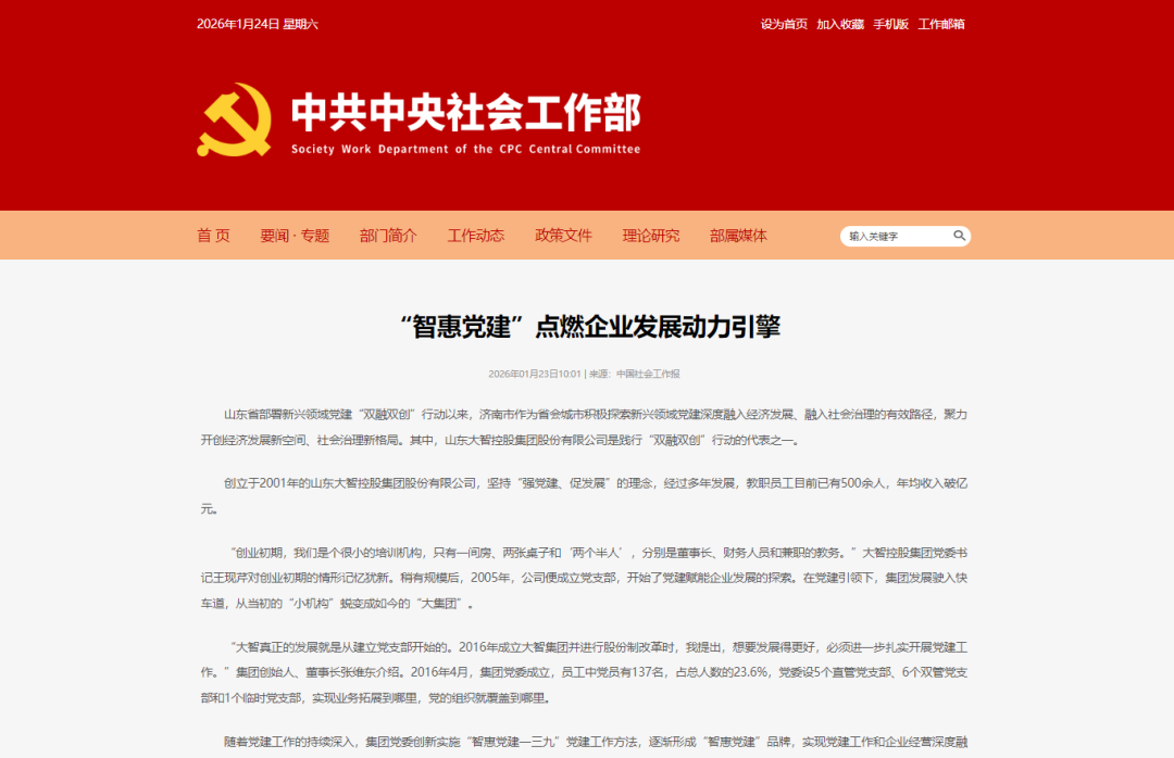 1月23日,中共中央社會工作部官方網(wǎng)站以《“智惠黨建”點燃企業(yè)發(fā)展動力引擎》為題,專題報道大智以黨建引領(lǐng)企業(yè)發(fā)展的創(chuàng)新探索與實踐成果。原文如...