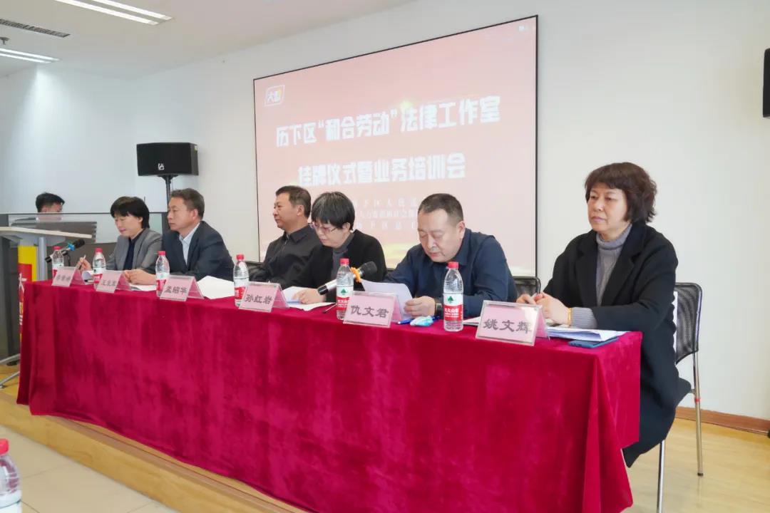 歷下區(qū)“和合勞動”法律工作室掛牌儀式由歷下區(qū)委組織部副部長,區(qū)人社局黨組書記、局長李素婷同志主持。濟南市人社局黨組成員、副局級領導干部孟昭華,濟南市總工會一級調研員常江,濟南市中級人民法院民一庭庭長孫紅巖,濟南市人社局勞動關系處處長王發(fā)軍,歷下區(qū)總工會黨組書記、常務副主席仇文君,歷下區(qū)人民法院副院長姚文輝出席。