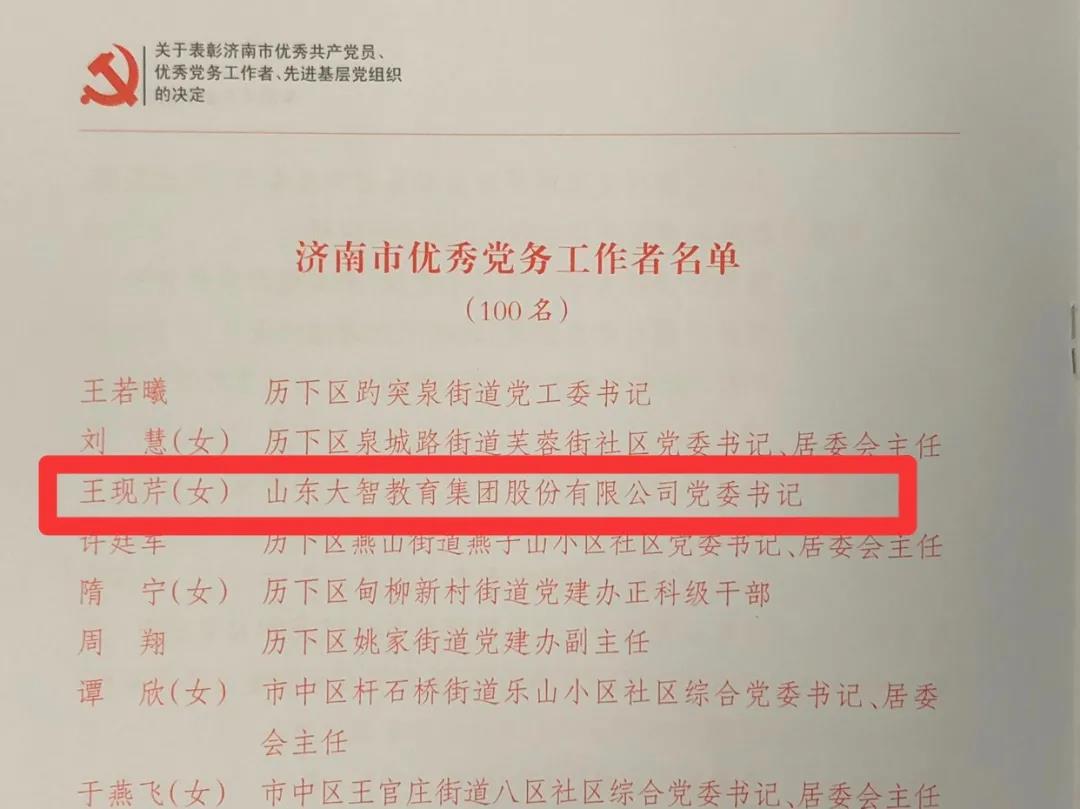 6月28日,在即將迎來中國共產(chǎn)黨百年華誕之際,濟(jì)南市優(yōu)秀共產(chǎn)黨員、優(yōu)秀黨務(wù)工作者和先進(jìn)基層黨組織表彰大會(huì)成功舉辦,省委常委、市委書記孫立成出席會(huì)議并講話。大智教育集團(tuán)黨委書記王現(xiàn)芹榮獲“優(yōu)秀黨務(wù)工作者”稱號(hào)并作為代表上臺(tái)領(lǐng)獎(jiǎng)。