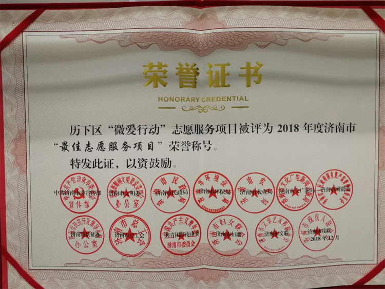 大智“微愛(ài)行動(dòng)”志愿服務(wù)項(xiàng)目被授予“山東省2018年度最佳志愿服務(wù)項(xiàng)目”和“2018年度濟(jì)南市最佳志愿服務(wù)項(xiàng)目”榮譽(yù)稱號(hào)。