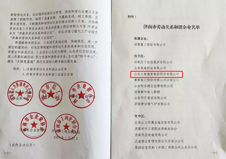 近日,濟(jì)南市人力資源和社會保障局、市總工會、市企業(yè)聯(lián)合會/企業(yè)家協(xié)會、市工商業(yè)聯(lián)合會聯(lián)合發(fā)文表彰先進(jìn),大智控股集團(tuán)被命名為“濟(jì)南市勞動關(guān)系和諧企業(yè)”。