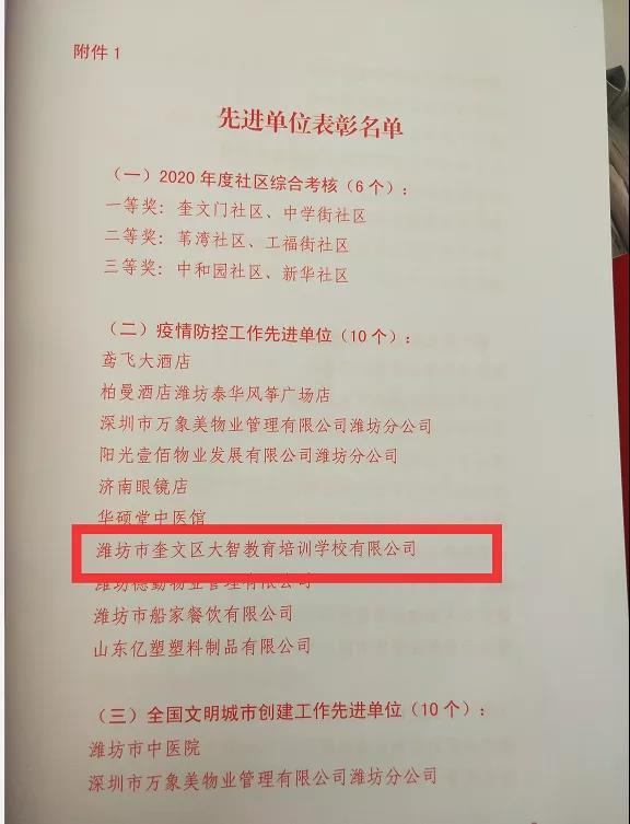 2020年新冠肺炎疫情爆發(fā)以來,大智教育集團(tuán)黨委積極響應(yīng)疫情防控要求,扎實(shí)開展各項(xiàng)疫情防控措施,近日,大智濰坊區(qū)域獲得“疫情防控工作先進(jìn)單位”榮譽(yù)稱號。