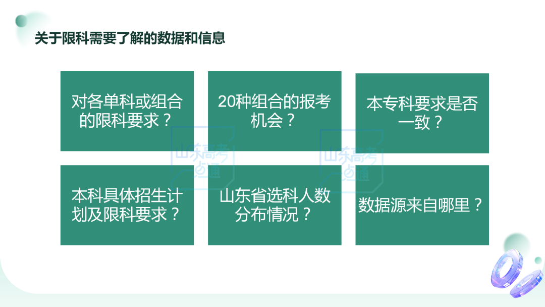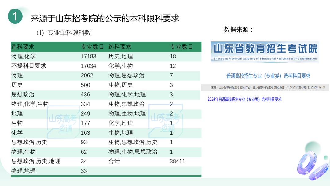 從圖中我們可以了解到,關(guān)于限科需要了解的數(shù)據(jù)和信息包含了六大方面,比如:相關(guān)大學(xué)和專業(yè)對(duì)各單科或組合有怎樣的限科要求,20種科目組合的報(bào)考機(jī)會(huì)是怎樣的,本科和??茖W(xué)校及專業(yè)對(duì)限科的要求是否一致,本科具體的招生計(jì)劃以及限科要求是怎樣的情況,山東省選科人數(shù)的分布情況,另外就是很多數(shù)據(jù)都是經(jīng)過數(shù)據(jù)源的分析,我們的家長(zhǎng)要了解數(shù)據(jù)源來自哪里,我們要掌握到第一手資料,然后有針對(duì)性地去看一看,才能夠更加確信相關(guān)的內(nèi)容。