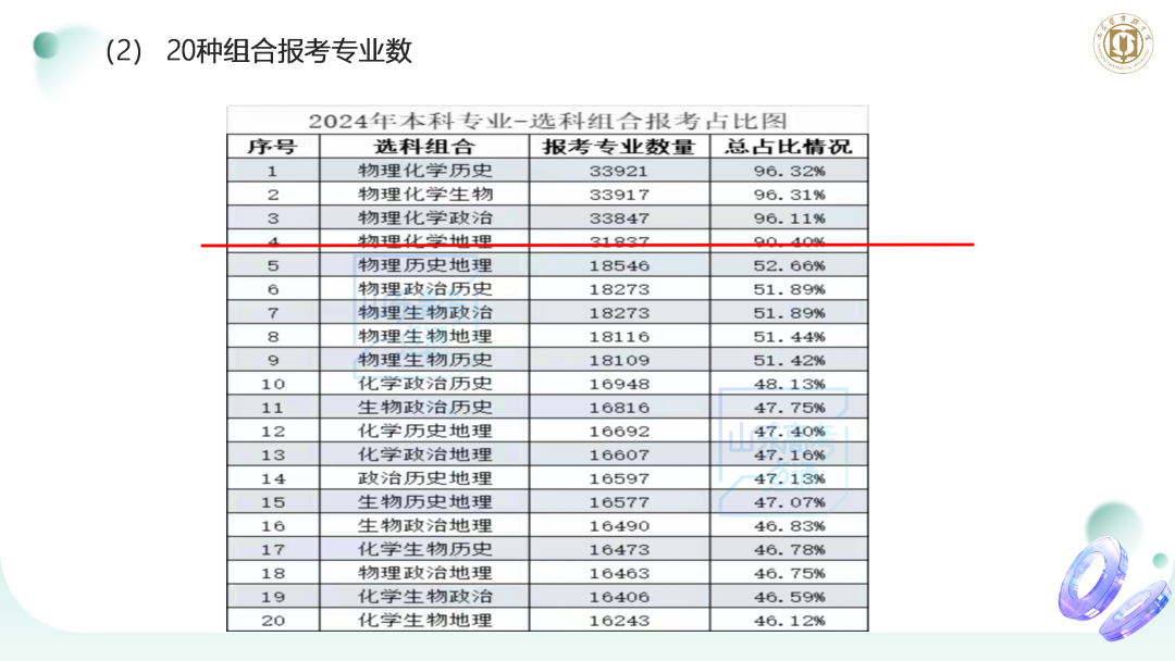 通過分析這個(gè)數(shù)據(jù),我們看到,物化加組合可報(bào)考的專業(yè)條數(shù)都在 90% 以上,下圖中紅線以上的部分里,我們可以看到相關(guān)結(jié)果。