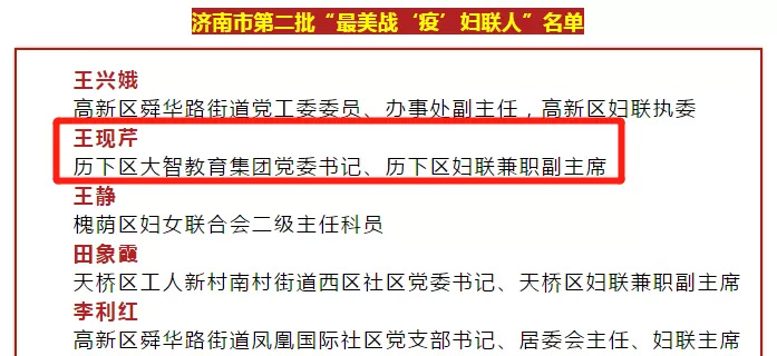 近日,濟(jì)南市婦聯(lián)公布了第二批最美戰(zhàn)“疫”巾幗典型,大智控股集團(tuán)黨委書記、婦聯(lián)主席王現(xiàn)芹被評(píng)為濟(jì)南市第二批“最美戰(zhàn)‘疫’婦聯(lián)人”。在疫情防控第...