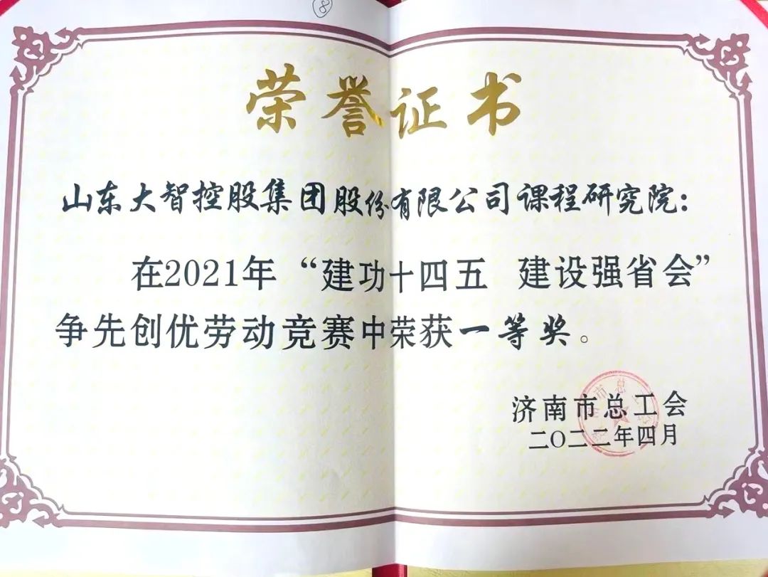 近日,濟南市總工會印發(fā)《關于表揚2021年“建功十四五 建設強省會”爭先創(chuàng)優(yōu)勞動競賽優(yōu)秀集體和優(yōu)秀個人的通報》,山東大智控股集團股份有限公司課程研究院榮獲2021年“建功十四五 建設強省會”爭先創(chuàng)優(yōu)勞動競賽一等獎。