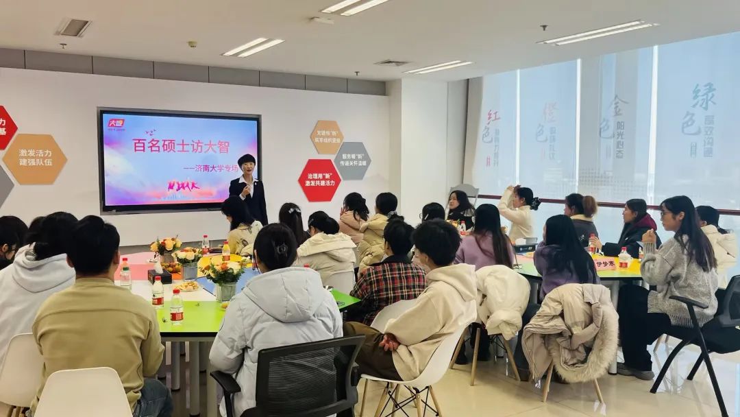 同學(xué)們參觀了集團(tuán)總部,了解了企業(yè)發(fā)展、企業(yè)文化建設(shè)等相關(guān)情況,以及“智惠黨建一三九”黨建工作模式,黨建引領(lǐng)下的“一帶一促”群團(tuán)建設(shè)理念和“智惠+”群團(tuán)建設(shè)模式。同時通過座談交流的形式了解了企業(yè)的人才需求、崗位要求及晉升空間等,通過校友分享感受了濟(jì)大校友在大智的成長收獲。