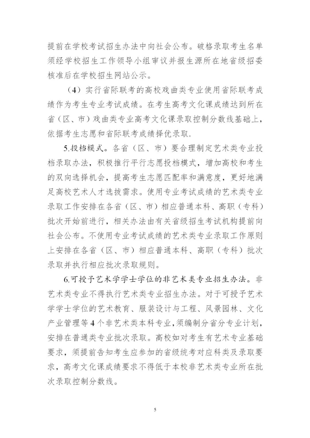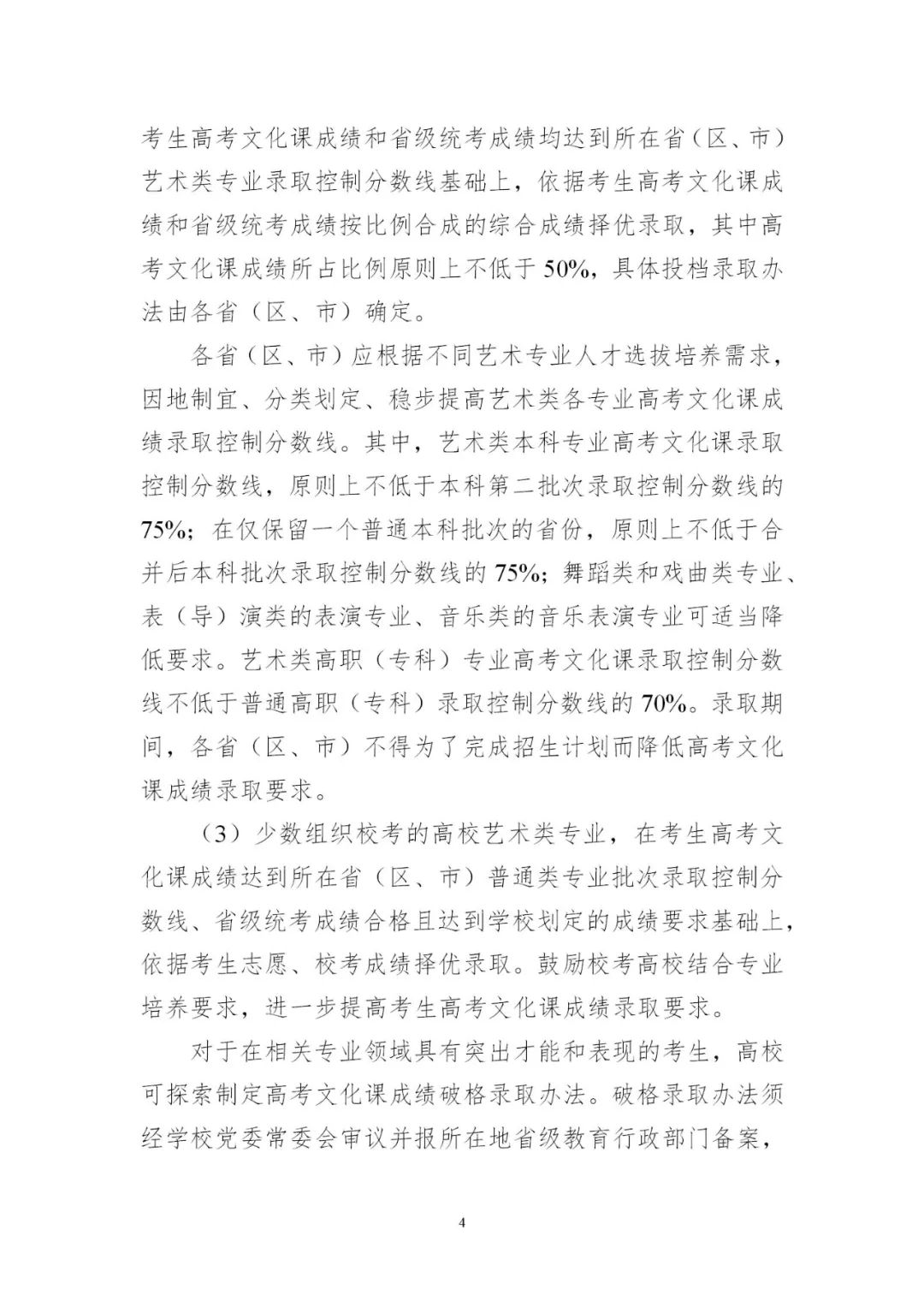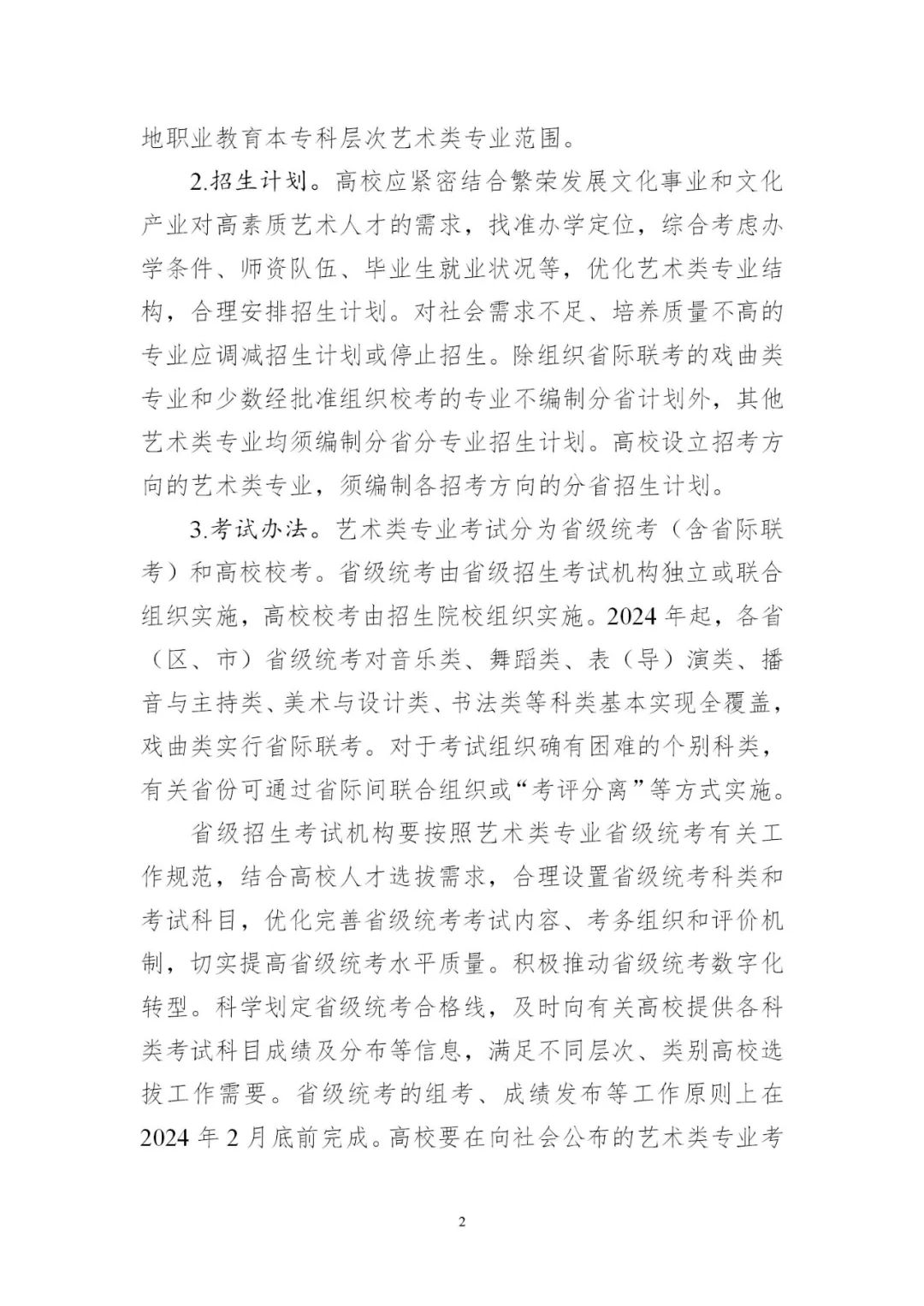 3.平穩(wěn)做好藝術類考試招生。各地要認真落實藝術類專業(yè)考試招生改革部署,進一步加強省級統(tǒng)考能力建設,考試科類基本實現(xiàn)全覆蓋。要對照有關工作規(guī)范,完善省級統(tǒng)考科目和內(nèi)容,優(yōu)化考試組織和流程,推進省級統(tǒng)考提質(zhì)增效。要科學制定藝術類專業(yè)招生錄取辦法,確保改革平穩(wěn)落地。少數(shù)專業(yè)特色鮮明、人才培養(yǎng)質(zhì)量較高的藝術院校,經(jīng)省級教育行政部門批準可在省級統(tǒng)考基礎上組織個別專業(yè)校考。有關高校要結合人才培養(yǎng)定位,科學制定??紝I(yè)考試招生辦法,加強與省級統(tǒng)考銜接,合理確定??夹问郊皟?nèi)容。2024年起,高校高水平藝術團不再從高校招生環(huán)節(jié)選拔,由有關高校從在校生中遴選培養(yǎng)。