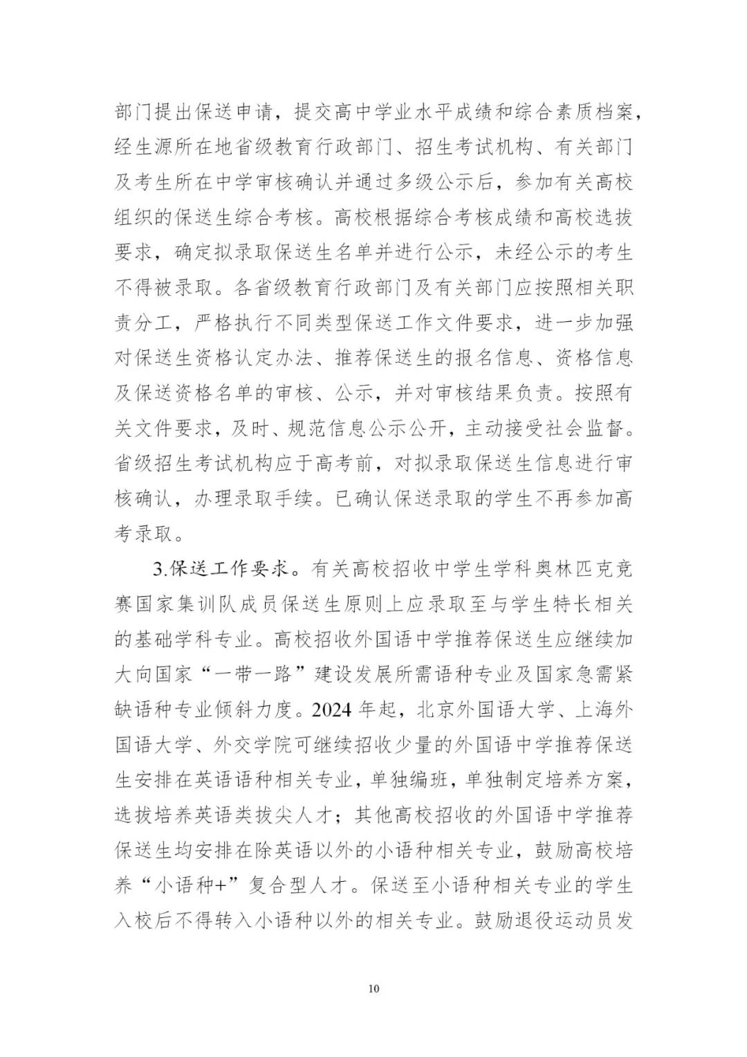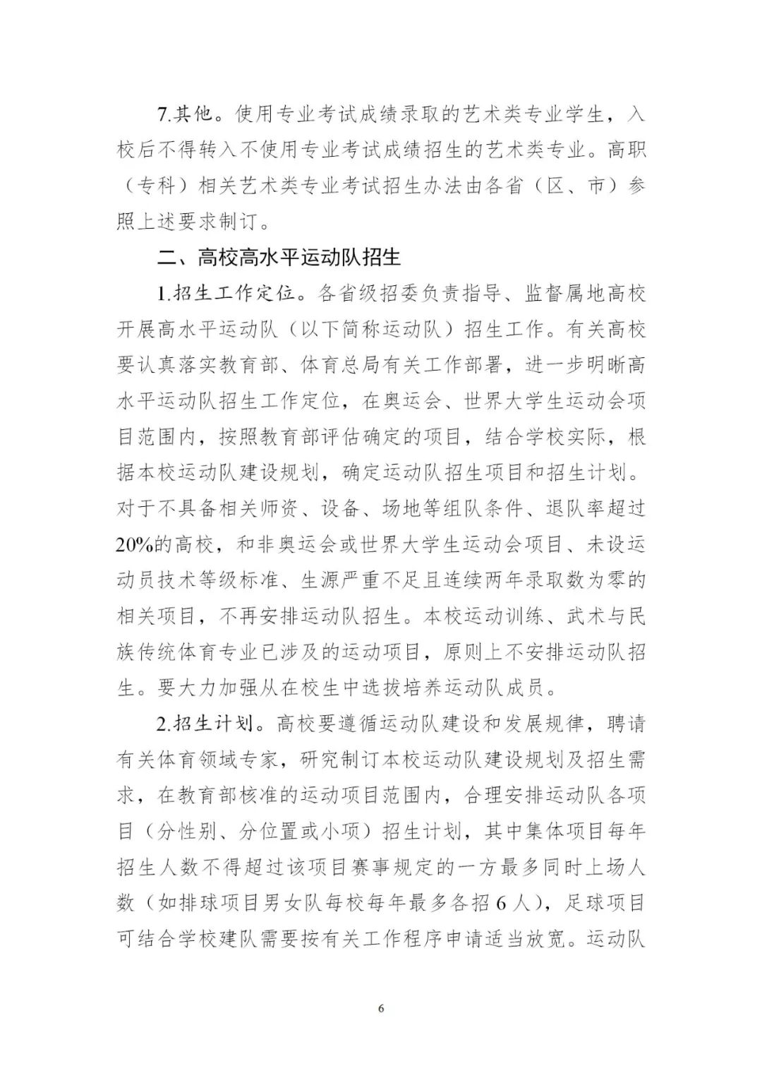 高校藝術類專業(yè)、高水平運動隊、保送生招生工作嚴格按照本通知要求執(zhí)行。教育部授權各地各高校組織的單獨招生、強基計劃、高校專項、綜合評價、拔尖創(chuàng)新人才選拔培養(yǎng)等考試招生工作參照執(zhí)行。本通知未盡事宜按照當年有關招生工作規(guī)定執(zhí)行。請各省級教育行政部門將本通知轉發(fā)至本行政區(qū)域內(nèi)有關高校。