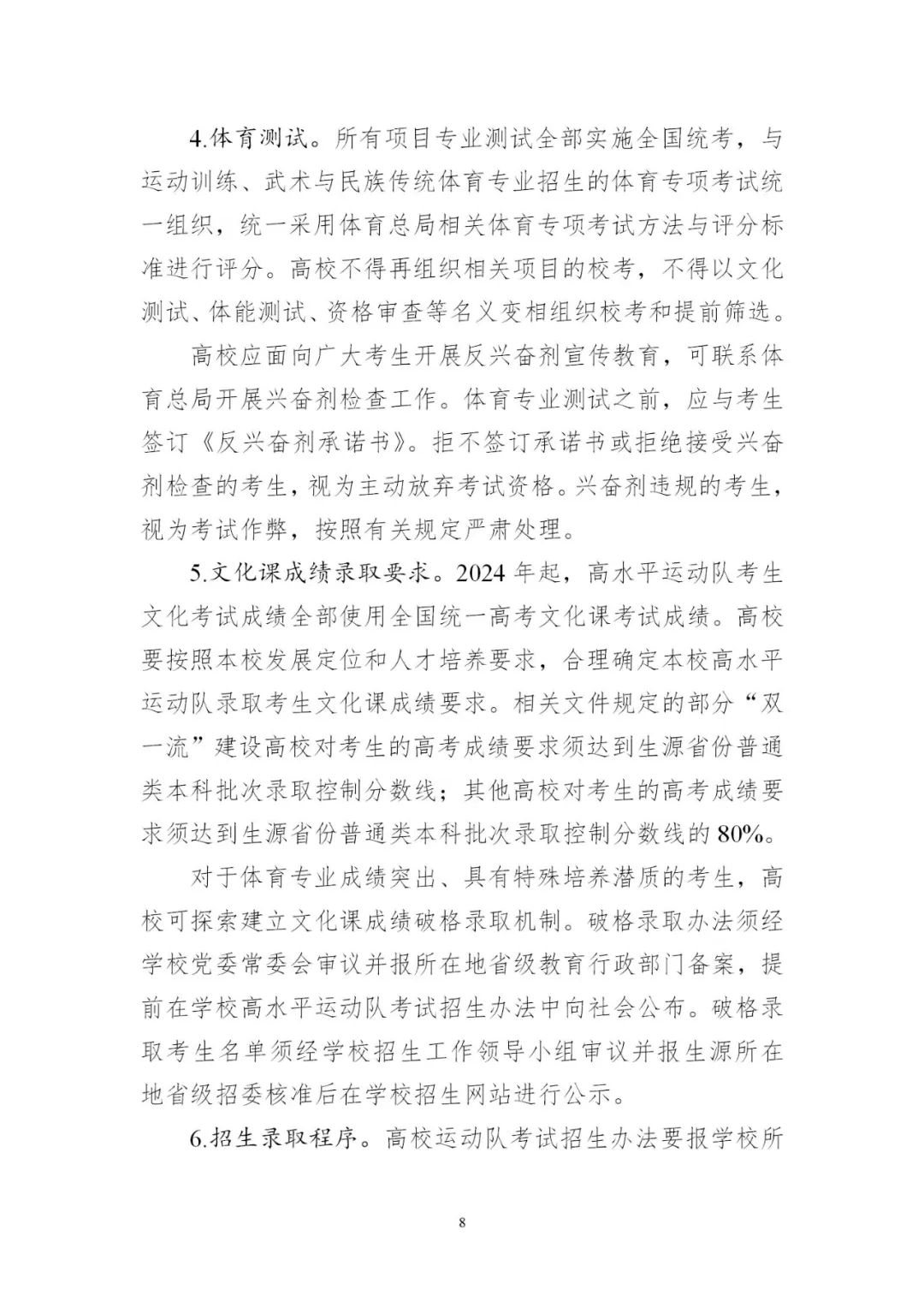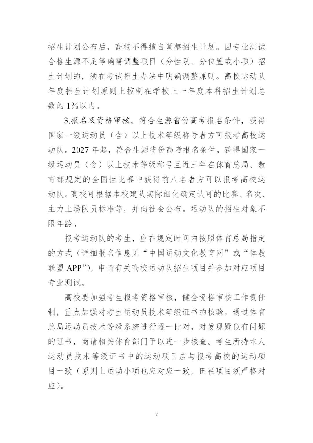 4.平穩(wěn)做好高水平運動隊考試招生。有關高校要緊緊圍繞高水平運動隊工作定位,根據(jù)學校運動隊建設規(guī)劃,優(yōu)化招生項目范圍。要嚴格招生程序,完善評價辦法和招生錄取機制,合理確定文化成績要求。2024年起,高水平運動隊考生文化考試成績?nèi)渴褂萌珖y(tǒng)一高考文化課考試成績;專業(yè)測試全部納入全國統(tǒng)考,由體育總局牽頭組織實施,高校不再組織相關校考。