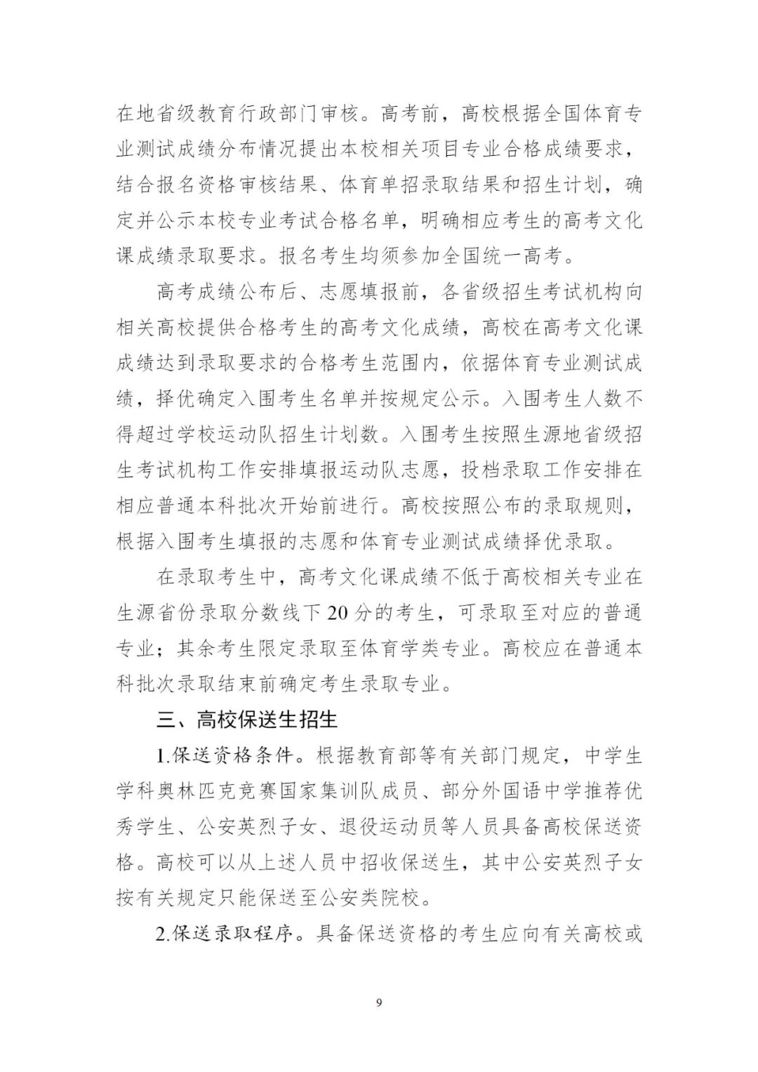 9.健全監(jiān)督制約機制。各地和有關高校要建立健全多級監(jiān)督制約機制,主動接受紀檢監(jiān)察部門監(jiān)督檢查,推動主體責任和監(jiān)督責任協(xié)同發(fā)力。認真執(zhí)行高校招生信息公開制度,按工作要求及時公布有關信息,主動接受社會監(jiān)督。未按要求公示的有關特殊類型考生一律不得錄取。暢通社會監(jiān)督舉報渠道,完善考生申訴復核機制,及時回應處理各種問題。加強新生入學資格審查和專業(yè)復測,對審查或復測發(fā)現(xiàn)問題的,組織專門調(diào)查并按有關規(guī)定進行處理。