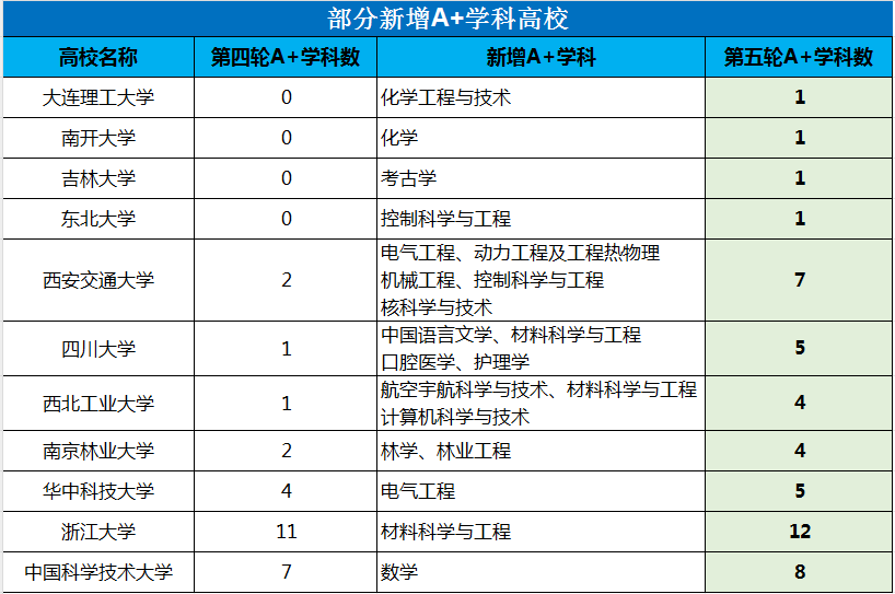 據統(tǒng)計:第五輪學科評估中新增A+學科最多的大學分別是西安交通大學(5個)、四川大學(4個)、西北工業(yè)大學(3個)。