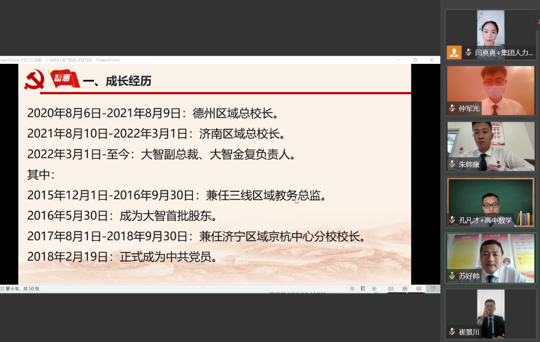 4月29日,大智控股集團副總裁蘇好帥為大智黨員們帶來了2021-2022財年“向陽計劃”專項培訓(xùn)第五講精彩內(nèi)容分享——《不忘初心 方得始終》。黨員通過視頻連線方式參加培訓(xùn)。